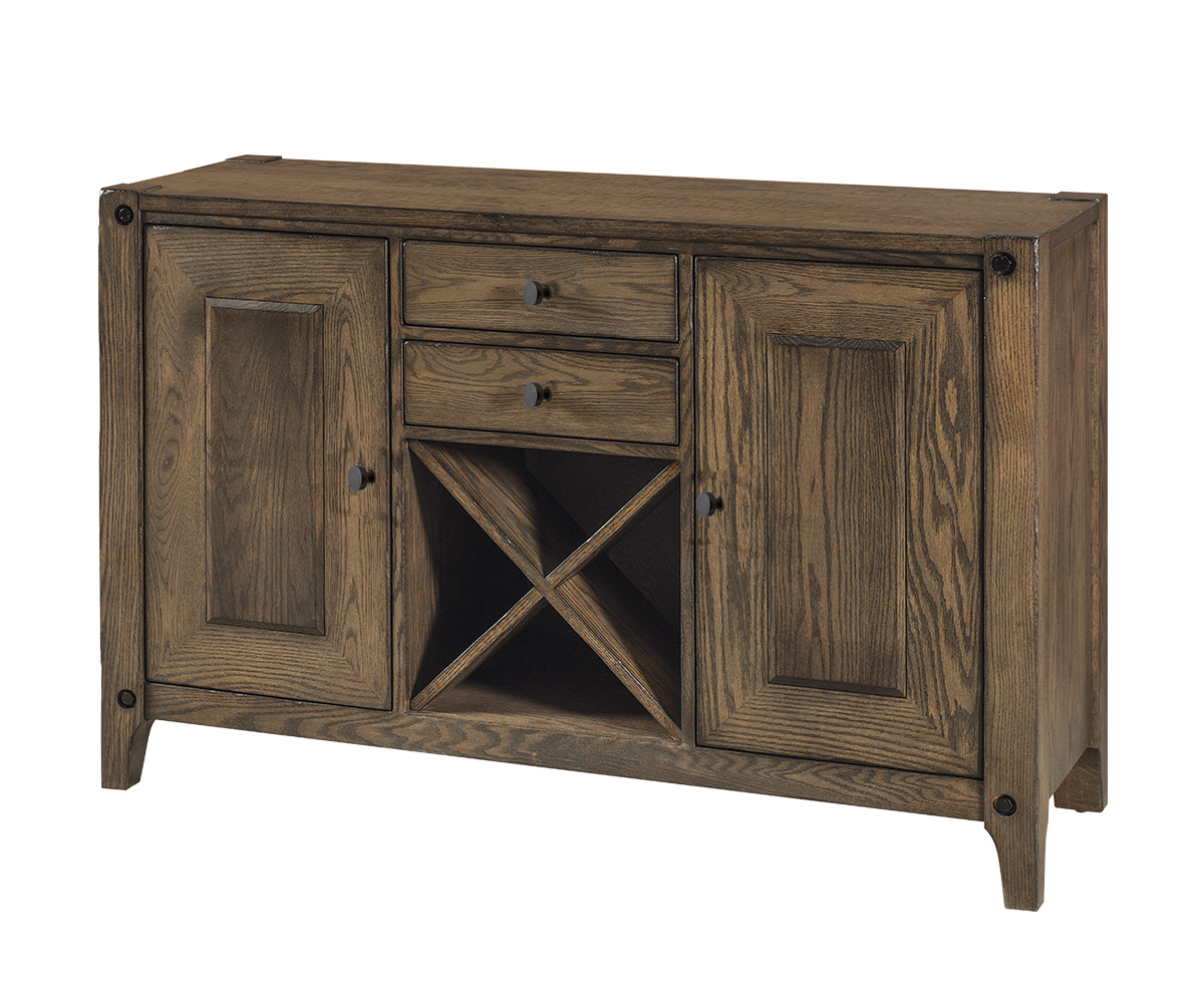Features: • Easily removeable wine rack in the center • Dovetailed drawers • Soft-close under-mount drawer slides • One adjustable wood shelf behind each door • Industrial bolts in the legs