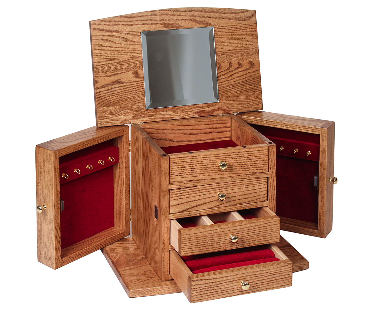Features: • Dovetailed drawers • One ring drawer • One three section divided drawer • Necklace holder on each side