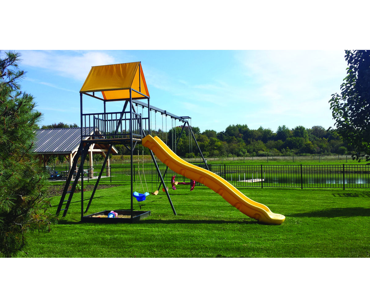 12′ High 5 Position A Frame 48″x54″ Platform with Canvas 14′ Slide 48″x54″ Sand Box